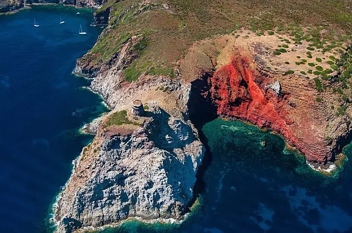 We continue towards Capraia, which offers a dream setting. Most of the island is a protected nature reserve; it is impossible not to mention Cala Rossa, which with its iron-filled cliffs offers a breathtaking contrast with the turquoise water, and Cala del Moreto which is home to a vast colony of seagulls under the conspicuous Torre dello Zenobito.