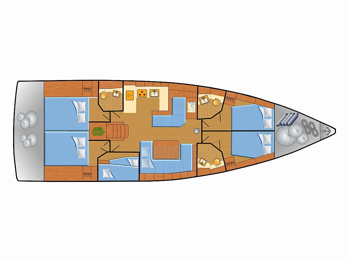 Refrigerator, Wi-Fi & Internet, Electric toilet, Bimini, Dinghy, Holding tank, Sprayhood, Cockpit cushions, Teak Cockpit